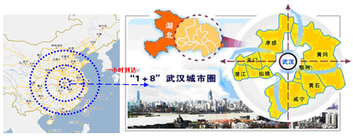 • 武漢交通陸路、水運、航空交通便利,素有“九省通衢”的美稱,與京、津、滬、穗、渝、西安等特大城市均相距約1200公里。